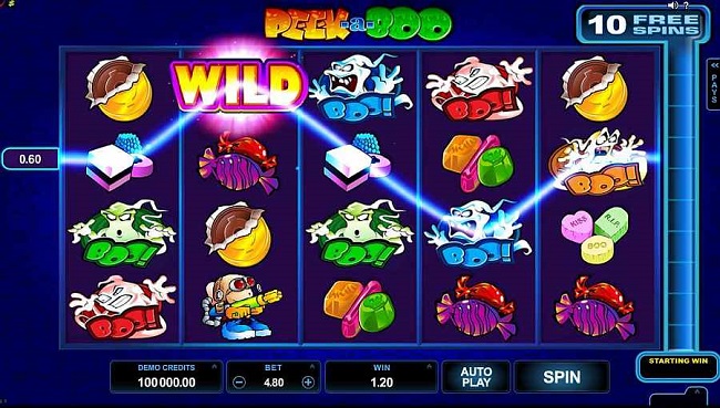 Peek A Boo Online Video Slot is a five-reel with forty pay-lines slot game powered by Microgaming. The slot is captivating and comical’. The horror-themed game is certainly colorful. The design of the slot is very cartoonish. The large reels set against a dark blue backdrop. The game involves ghosts, a ghost hunter and lots of sweets to provide you with winning opportunities.