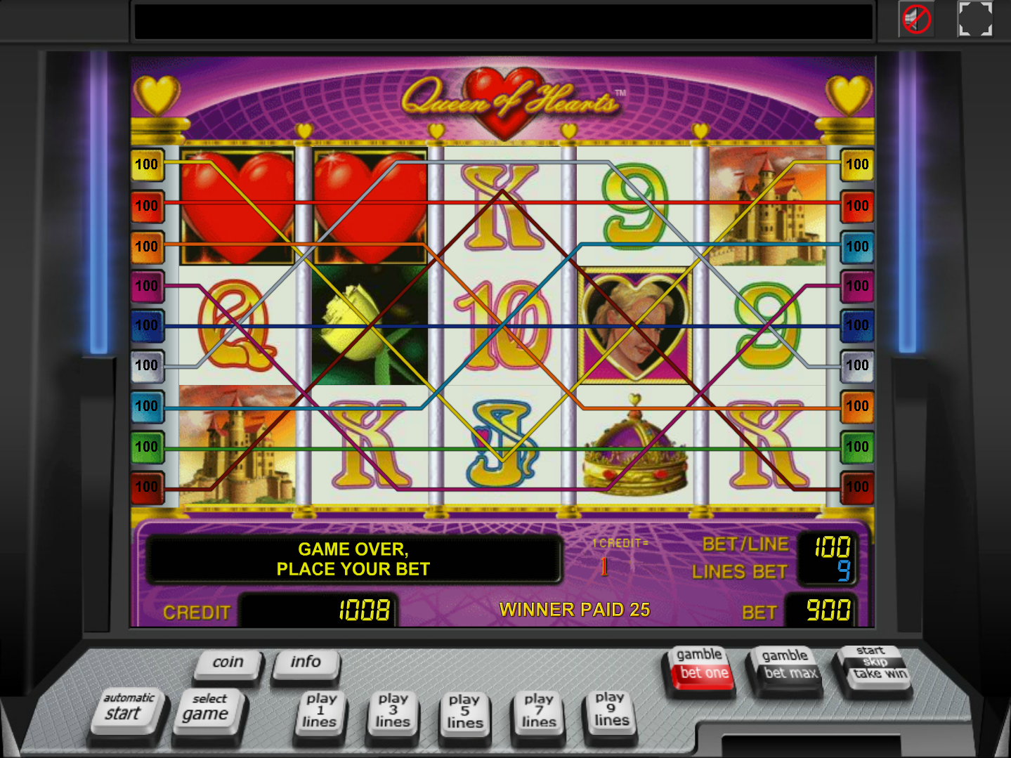 Queen of Heart Online Video Slot is a 5 reel with 10 paylines video slot powered by Novomatic. The slot features a theme involving the Queen of Hearts who shows much love on the reels. It is a fairytale of this beautiful queen of hearts assisted by Cupid and spreading love to all. You will find love related symbols such as ruby rings, crowns and fairytale castles. The features include scatters, wilds and free spins feature. The slot can be played from all devices supported by Mac, Linux or Windows operating systems.