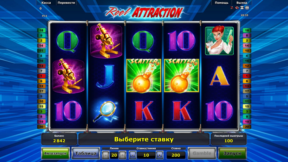 Reel Attraction Online video Slot is a 5 reel with 20 paylines video slot powered by Novomatic. The slot has a scientific theme with a mad professor being the main character of the game. The mad professor will expand on the reels to give you even better payouts. Then there are magnet wilds appearing on the reels that will give you a re-spin. The slot is also designed with nice graphics and animations. The slot can be played from devices supported by Mac, Linux or Windows operating systems.
