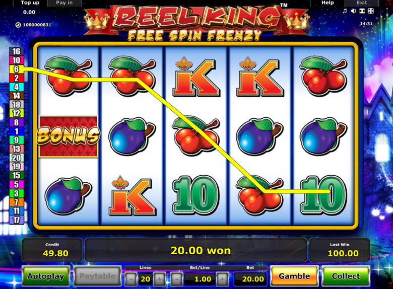Reel King Free Spin Frenzy Online Video Slot is a 5 reel with 20 paylines video slot powered y Novomatic. The first Reel King slot had no free spins feature. The maker has now added this free spins frenzy version to players who loved the slot but were disappointed by the omission of the free games feature. The slot has some awesome feature just okay for a fruit symbol slot. You can now spin up to 10 free spins that can be retriggered.  The slot can be played from devices supported by Mac, Linux or Windows operating systems.