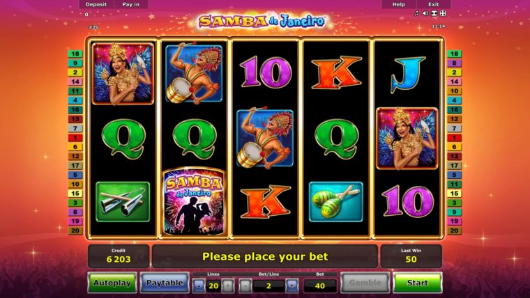 Samba De Janeiro Online Video Slot is a 5 reel with 20 paylines video slot powered by Novomatic. The slot is based on the Brazilian Samba festival that takes place in the streets of major cities in Brazil. In particular the city of De Janeiro is always the busiest with Samba music dancers during this carnival. On the background you will find some fireworks lighting up the sky and the beautifully dressed Samba dancers. This slot opens doors to game features that can win you great prizes such as the free spins feature with 12 rounds, wild symbol bonuses and many more.