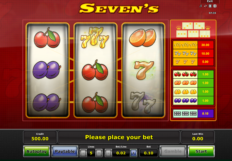 Seven’s Online Video Slot is a 3 reel with 5 adjustable paylines video slot powered by Novomatic. The slot has an old design of the fruit machines and retro symbols. It is all about the lucky 7s and you will find highly valuable 7s appearing in double and triple bars to give you the best payouts. The slot is not so much complicated or loaded with features; there are no free spins, scatters, wilds or bonuses. You will win prizes based on the kind of symbols you line on the reel spaces. You can also win the jackpot. The slot can be played from devices supported by Mac, Linux and also Windows operating systems.