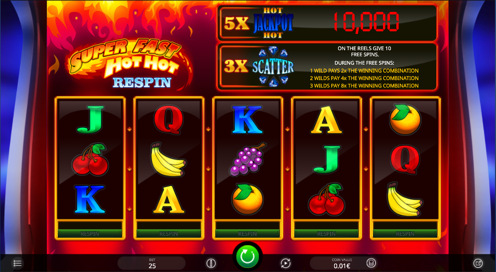 Super Fast Hot Hot Respin Online Video Slot is a 5 reel with 25 paylines video slot powered by iSoftbet. This is a classic fruit machine with a modern twist. The slot comes with respins, stacked diamond symbols for respins, free spins and wild multipliers. In the free spins particularly you can win up to 8x your wins when you trigger the free spins with 3 wilds on the combination.