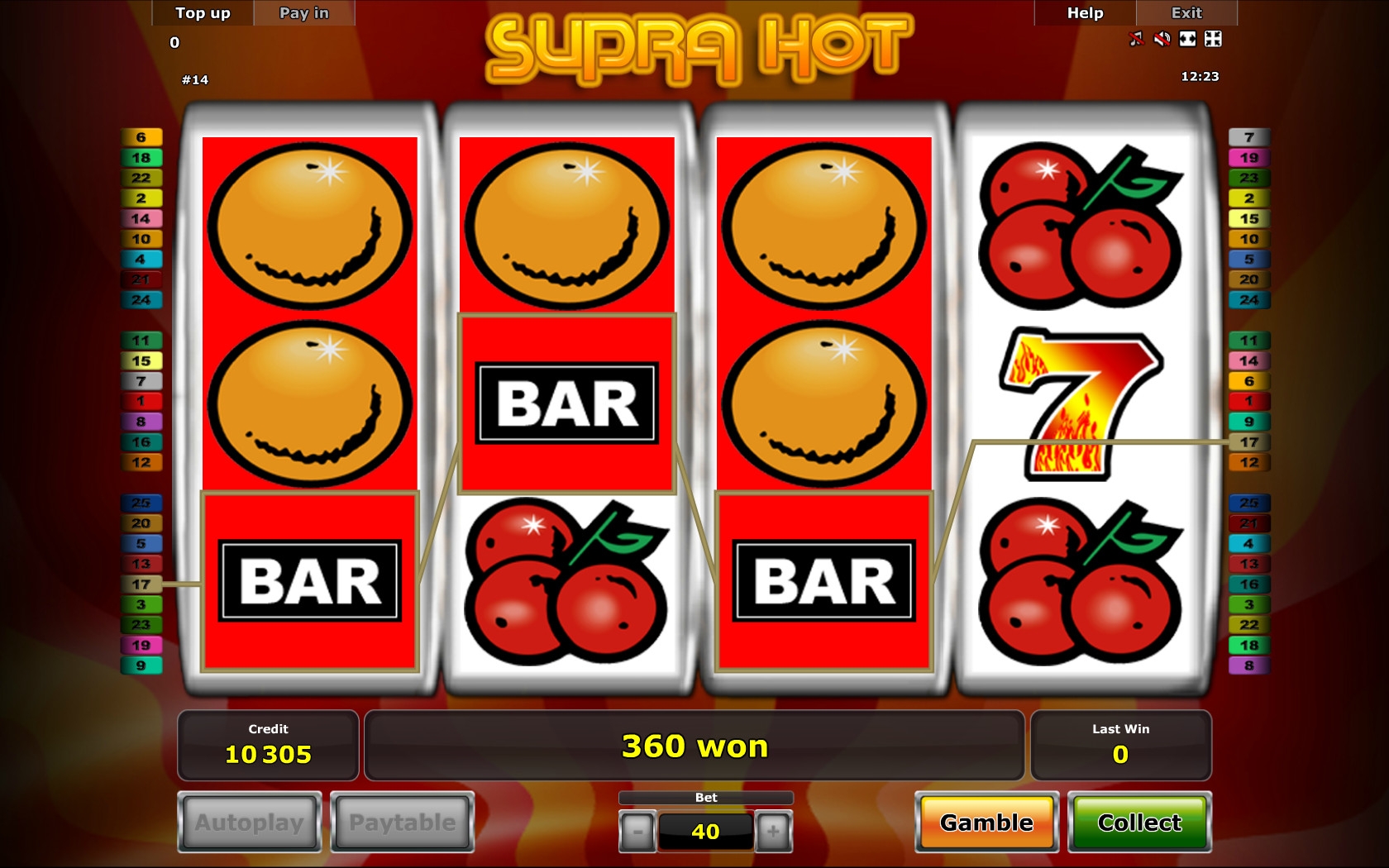 Supra Hot Online Video Slot is a low variance classic designed slot. The wins you can make from this slot are just too small. The game play is also easy and the graphics are not that great. There are no special features or symbols that will give you those good wins. If you decide to stake on this slot then you need to play the max bet to get something tangible out of it.