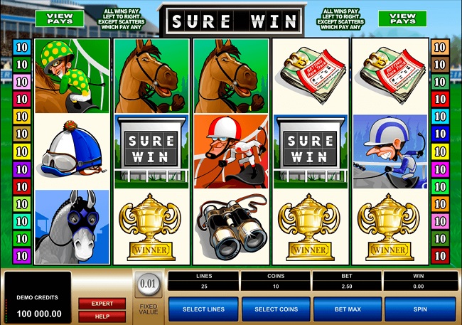 Sure Win Online Video Slot is a five-reel with twenty-five pay-lines slot game powered by Microgaming. The reels are against the backdrop of a real photo of a horse racing venue. Moving on to the reels they contain an entertaining mixture of cartoon quality symbols. It comes complete with an authentic track soundtrack and a bonus feature.