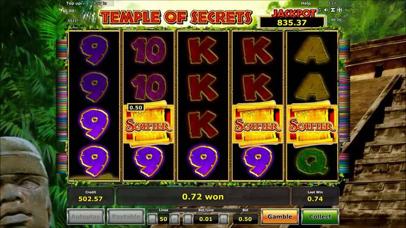 Temple of Secrets Online Video Slot is a 5 reel with 50 paylines video slot powered by Novomatic. The slot takes you to Central American in the jungle to find a temple of secret riches. It has a treasure quest adventure theme. On the background you will see a temple within a jungle which is probably the temple of secrets. You can win payouts by landing the symbols on the reels from left to right. There are wilds, scatters, free spins and bonus multipliers. The slot can be played from devices supported by Mac, Linux and also Windows operating systems.