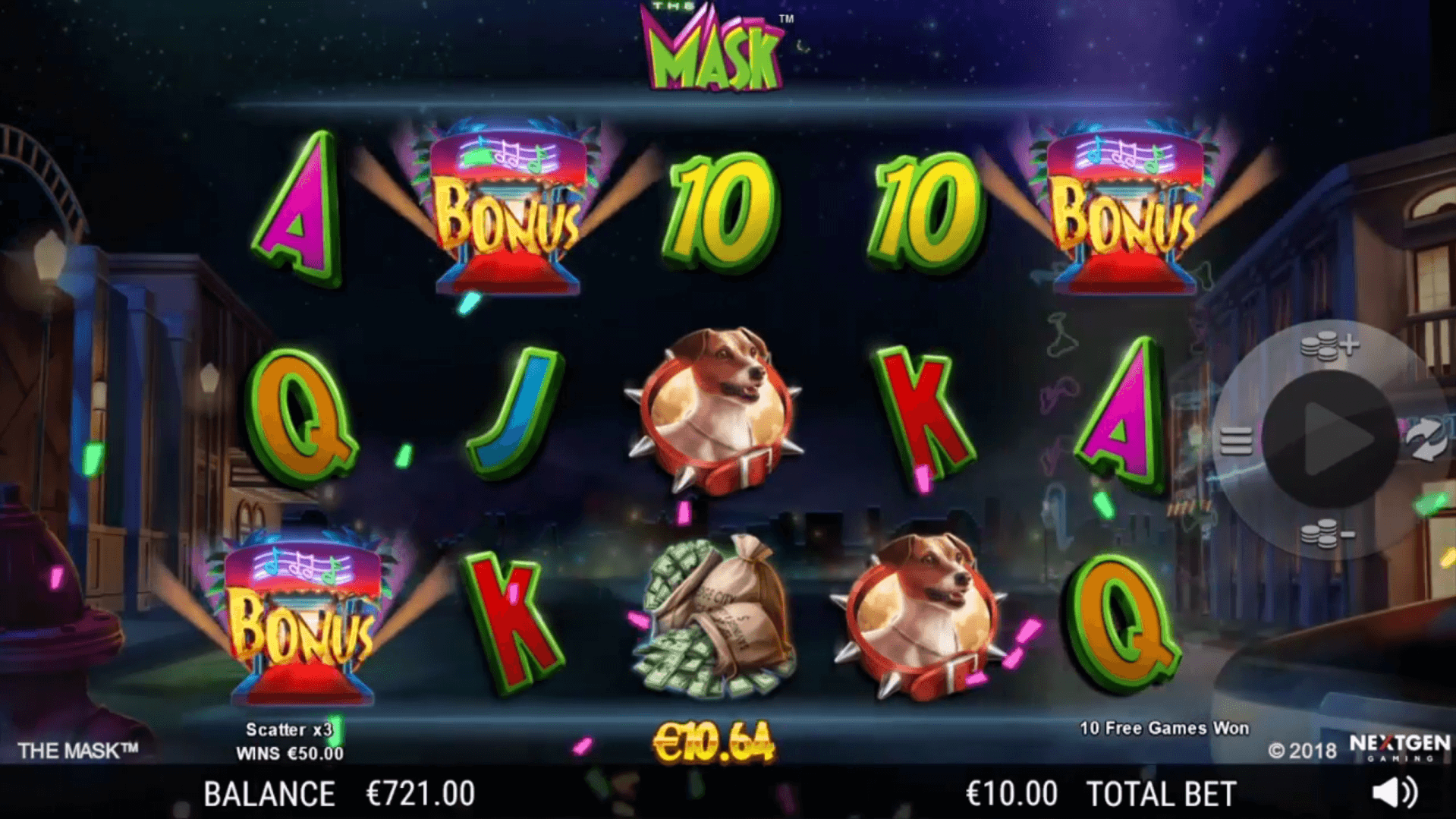 Landing 3, 4 or 5 bonus scatters on the reels will win you 10, 15 or 25 free spins respectively. The wild Mask will also appear and multiply your wins 2x, 3x, 4x or 5x. You can also trigger more free spins if you land more scatters on the reels.