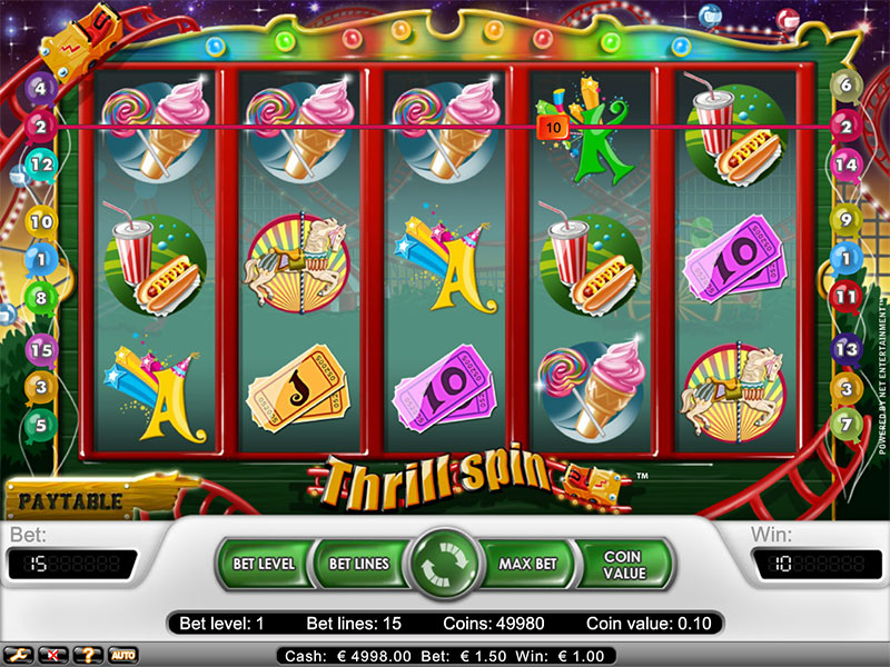 Thrill Spin Online Video Slot is a 5 reel with 15 paylines video slot powered by Net Entertainment. The setting is in park with roller-coaster and merry go-rounds. The theme is of a fun day or an outing in the park with children playing and eating ice cream and candies. The park is crowded with amusement and the mood is generally celebratory. The slot is played on 3 rows and 5 reels. It has scatters, wilds, multipliers and also free spins. The slot is also compatible with Linux, Mac and Windows operating systems.