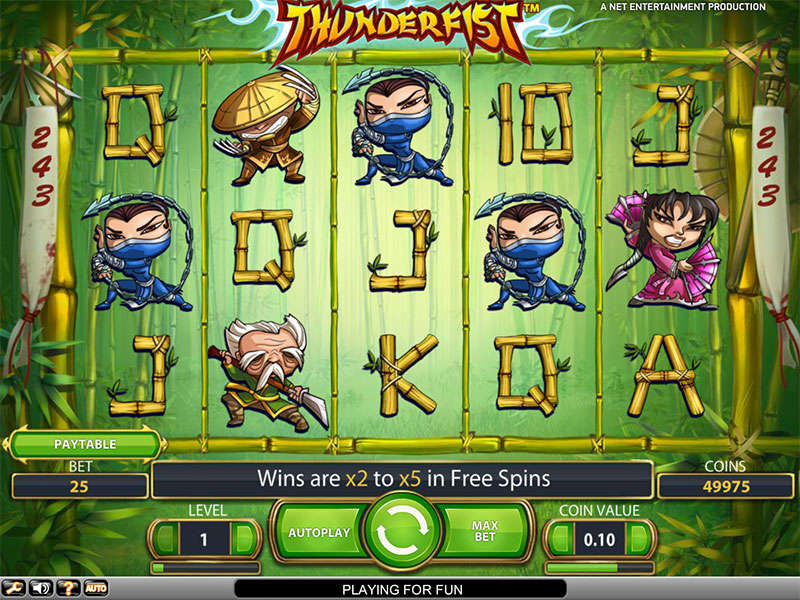 Thunderfist Online Video Slot is fun slot to play. Get to interact with the samurai and Kungfu martial artists as they train to get rewards. The free spins and the symbols payout is the main features to look out for. The Net Entertainment autobet feature is also available here.