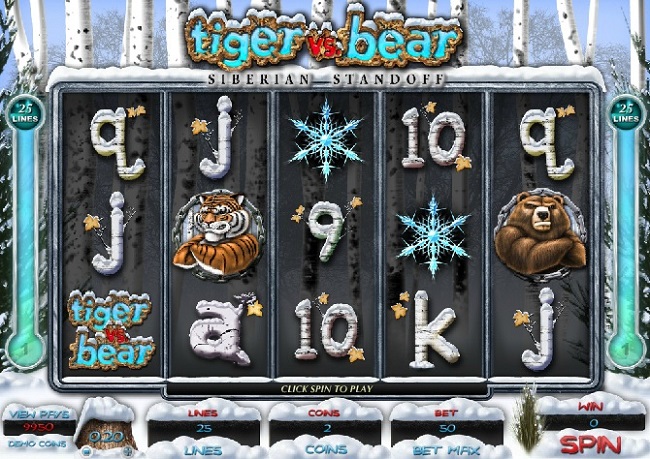 Tiger Vs. Bear Online Video Slot is a five-reel with twenty-five pay-lines slot game from Microgaming. In the wilds of Siberia, there’s a secret battle going on every single day. The Tigers and bears roam the landscape and battle each other for dominance of the freezing environment. The snow is a big part of the game. It blankets the reels and the ground below them. In the background, one can see a bleak forest scene and a chilly northern sky.
