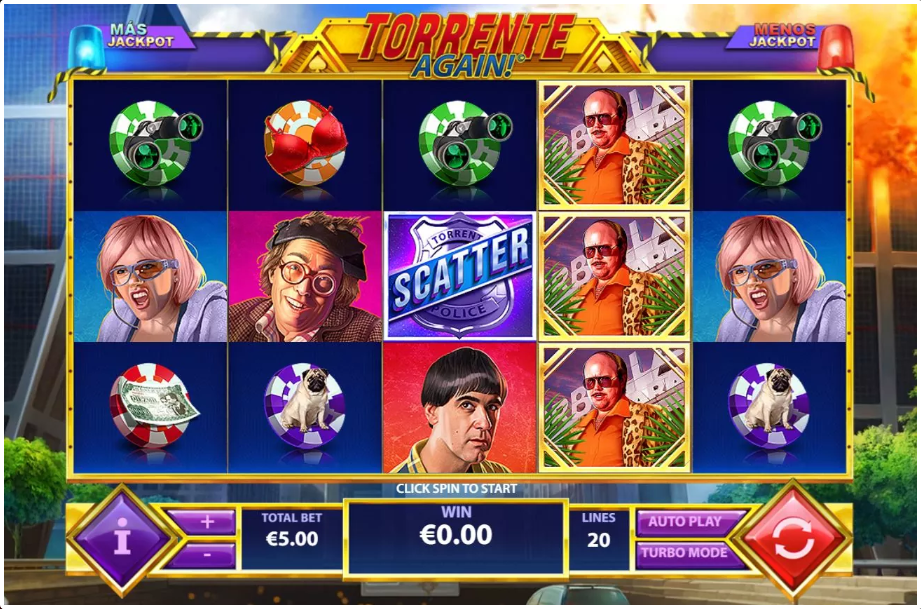 Torrente Again Online Video Slot is a 5 reel with 20 paylines video slot powered by Playtech. The slot is based on a Spanish cinema about detective Torrente. The setting is within the gate of Europe towers mainly from Madrid. Most of the symbols are from the film franchise with the Torrente being the highest paying symbol. You will play with features such as slave bonus offering cash prizes and the free spins feature with wild symbols. The slot can be played from a mobile device.