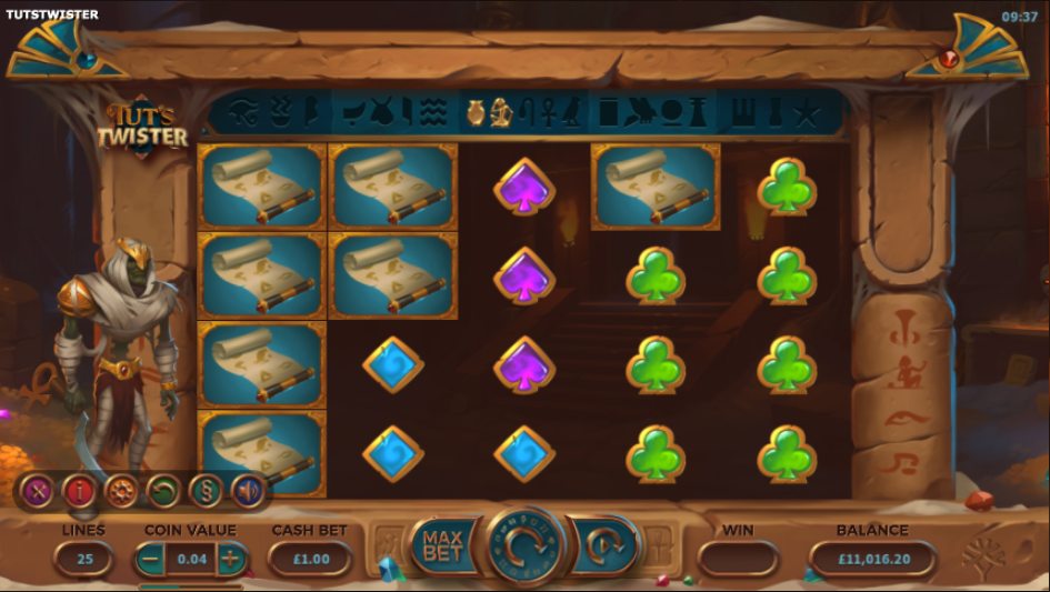 Tut’s Twister Online Video Slot is a 5 reel with 25 paylines video slot powered by Yggdrasil Gaming. The slot has an ancient Egyptian theme featuring King Tut. In the slot he is raised from his tomb to create more wins on the reels as well as help players trigger special features. The slot can be played from devices supported by Mac, Linux or Windows operating systems.