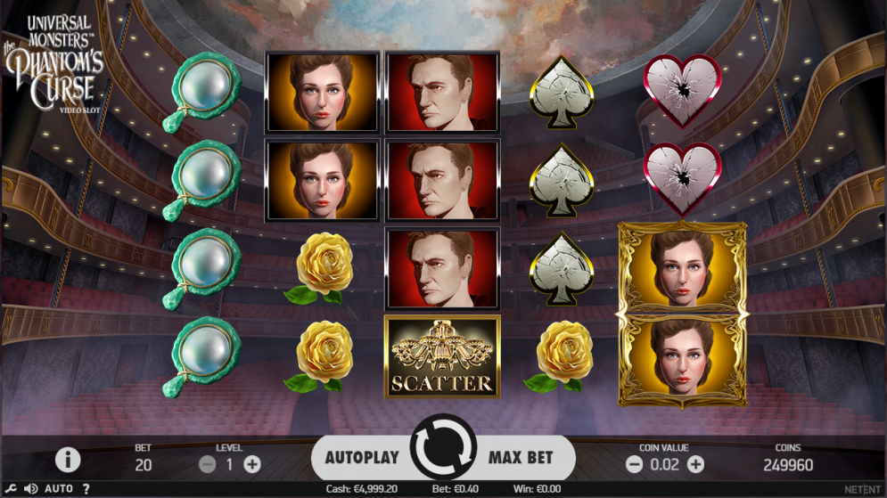 Universal Monsters: The Phantom Curse Online Video Slot is a 5 reel with 40 fixed paylines video slot powered by Net Entertainment. The setting is in an Opera house. The theme highlights the story of a haunted opera house. Renamed after the initial title “The Phantom of the Opera” ran into some licensing issues. There are stacked symbols, wild symbols, free spins, click bonuses and also a re-spin feature. The slot is also compatible with Linux, Mac and Windows operating systems.