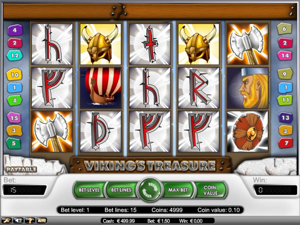 Viking’s Treasure Online Video Slot is a 5 reel with 15 paylines video slot powered by Net Entertainment. The game’s theme is about the Scandinavian Viking culture. Sail through the cool waters in an ancient Scandinavian ship as you set put to find treasurers with fellow Vikings. The slot looks retro not as the recent generation of slots but it has excellent graphics and animations. There is also a soothing wood sounds as if someone is sailing a row boat and then a burst with swords and shield sounds colliding. Every game step is animated especially when you find the scatter symbols, free spins and wilds.