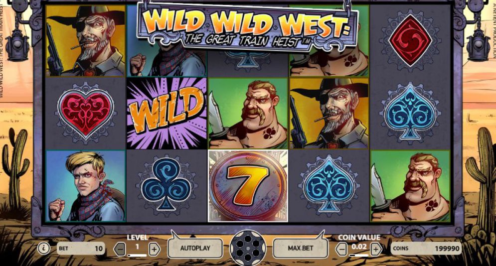 Wild Wild West: The Great Train Heist Online Video Slot is a 5 reel with 10 paylines video slot powered by Net Entertainment. The theme is about a steam train robbery by 4 villains in the Wild West. The story is adopted from a comic book and it is nicely designed into a slot. The slot has great graphics and also excellent animations. Help the villains raid the trains and get rewarded with scatters, free spins and bonuses.