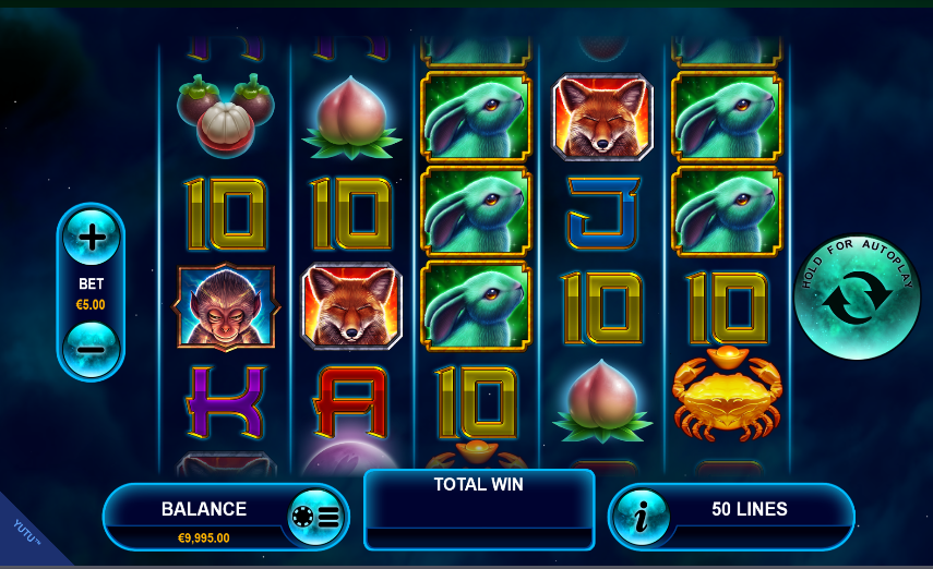 The wild symbol is represented by the golden crab symbol. The wild appears on the reels 2, 3, 4 or 5. It can substitute for all the other symbols except the scatter symbol to complete winning combinations. The scatter is represented by the rabbit silhouette in the moon and it appears on reels 1, 2 and 3 only.